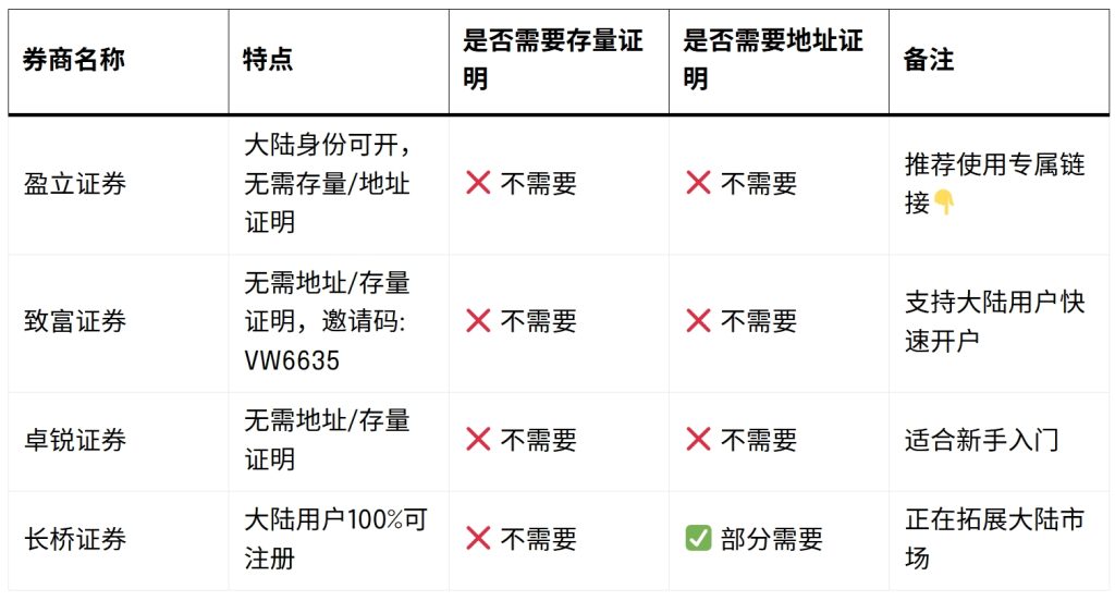 | 盈立证券 | 大陆身份可开,无需存量/地址证明 | ❌ 不需要 | ❌ 不需要 | 推荐使用专属链接👇 |