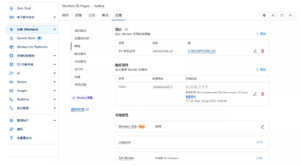 3. 给worker绑定上键值对,【以及设置定时执行时间!】 注意:这里的名称一定是:SUBSCRIPTIONS_KV 否则后面需修改参数无法保存!