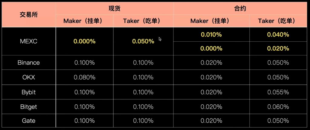 | 交易所 | 现货吃单 | 现货挂单 | 合约手续费 |