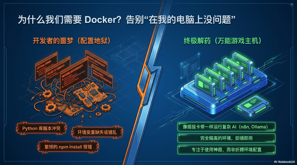Docker 不再是程序员的专利。在 AI 时代,它是我们普通人低成本、高效率、极安全地折腾各种黑科技工具的最佳底座。