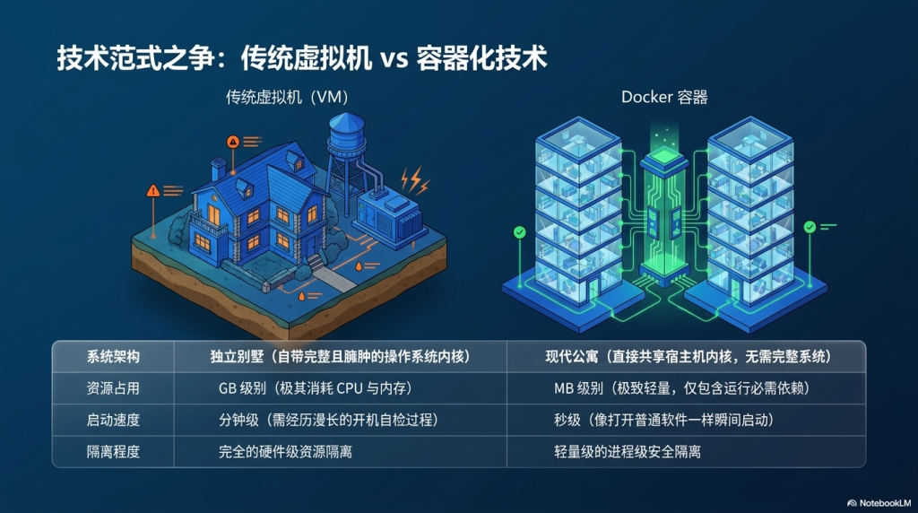 它和传统虚拟机(VM)有什么区别? 虚拟机像背着一整栋大楼跑,因为它包含了一个完整的操作系统,启动慢且占内存; 而 Docker 容器非常轻量,它直接共用电脑的系统内核,启动只需几秒钟,一台电脑甚至能同时跑上百个容器。