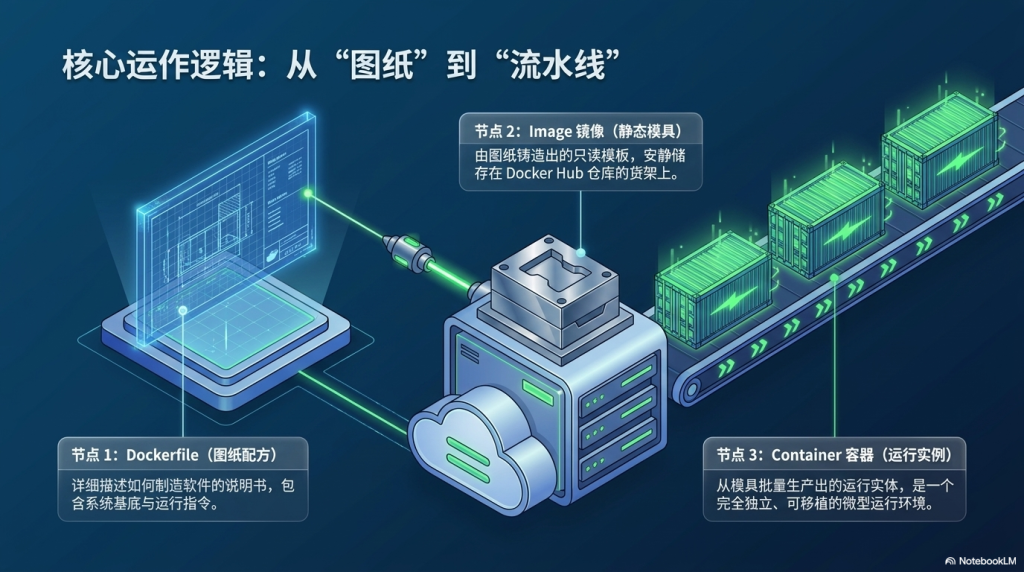 - 集装箱: 就像海运集装箱,Docker 把程序和它所有的依赖包(软件库、配置等)通通塞进一个箱子里。无论箱子运到 Windows、Mac 还是 Linux 操作系统,里面的内容都能原样运行。