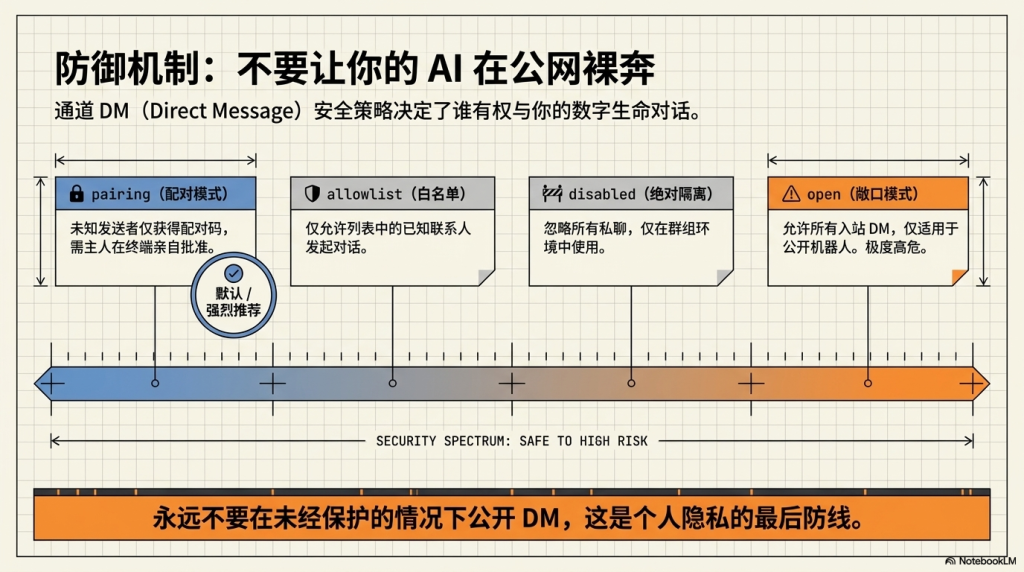 dmPolicy设置为"pairing"(需主人批准配对码)或"allowlist"(仅允许白名单成员)。 - 技能扩展:可以使用