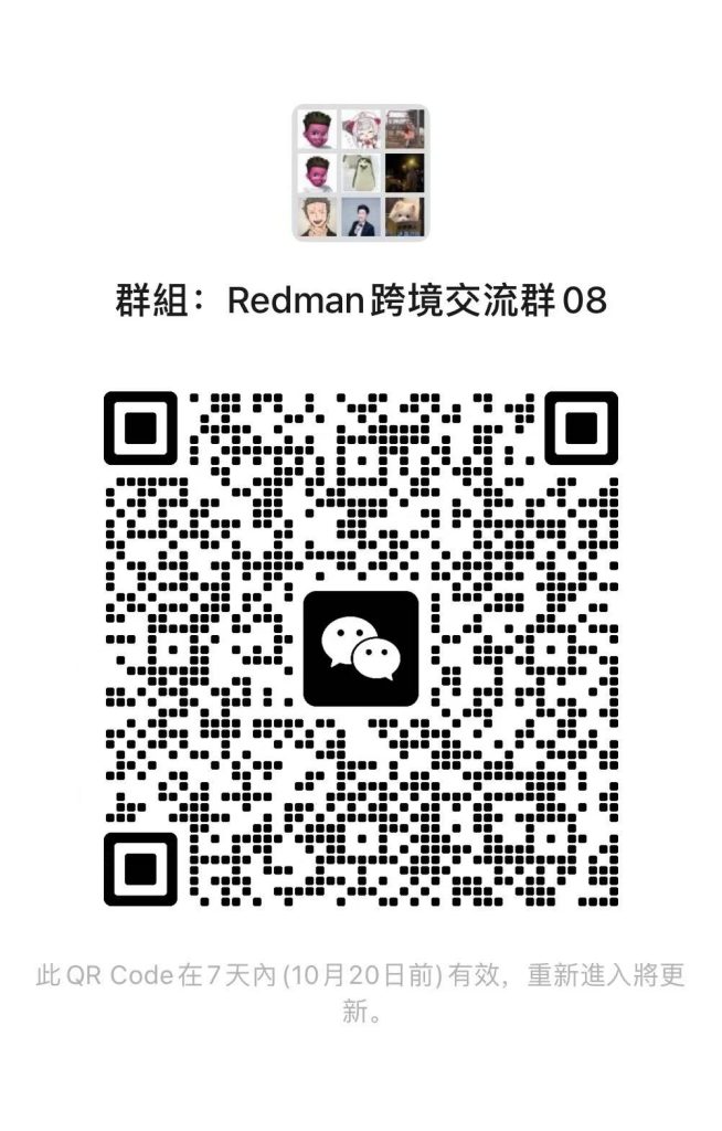 “Redman跨境交流群01-07″已满200人无法扫码入群,可加redman微信或者Line▶redman3721,入群!